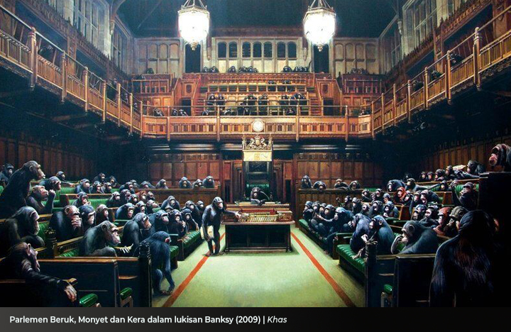 Tahun 2009 di Inggris, seorang pelukis jalanan, Banksy membuat lukisan satir yang sangat sarkastik, bagaimana monyet, kera, dan beruk bersidang di gedung parlemen.