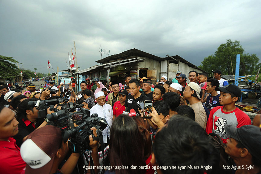 AKARPADINEWS.COM | HARI yang panjang. Selasa (11/10/16) Agus Harimurti Yudhoyono yang populer dipanggil AHY, mengunjungi masyarakat di Jakarta Utara. Bakal kandidat Gubernur DKI Jakarta, itu berinteraksi langsung dengan masyarakat Koja, kampung Nelayan Muara Angke, Rusunawa Sindang. Agus ditemani isterinya, Annisa Larasati Pohan dan manajer kampanye tim pemenangan, Wishnu Wardhana.