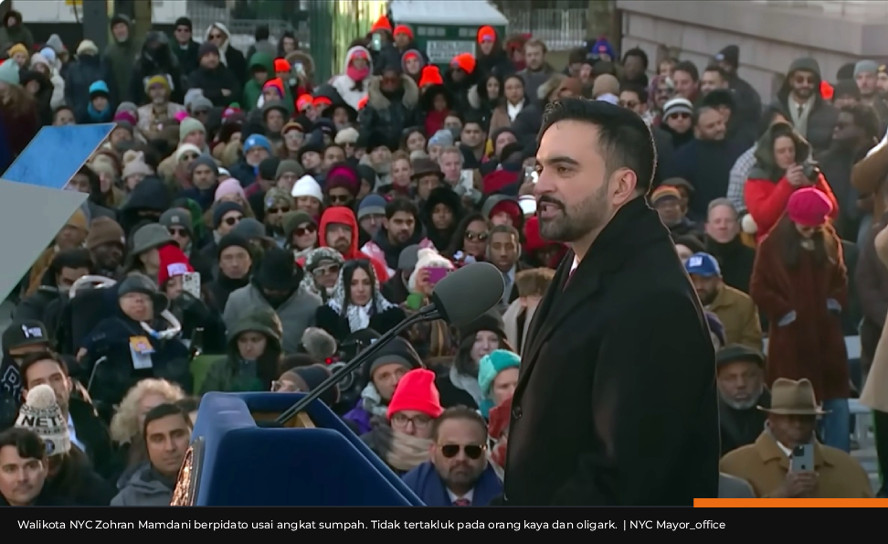 KESEDERHANAAN yang memancar dari rangkaian pelantikan dan angkat sumpah resmi Zohran Kwame Mamdani sebagai Wali Kota New York - Amerika Serikat (Kamis, 1/1/26) di tangga Stasiun Sub Way City Hall, dan pelantikan yang melibatkan khalayak di beranda Balai Kota New York sarat makna.