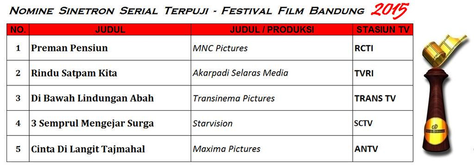 Untuk FFB 2015 pada kategori sinetron serial dan film televisi, selain sinetron / FTV-nya, nominasi diperoleh pula dari segala unsur yang terlibat dalam penggarapan film itu. Dari 300 sinetron, ungkap Eddy D. Iskandar, panitia menyaring dengan nominasi-nominasi tertentu yang sama seperti Festival Film Bandung tahun lalu.