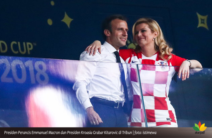 Sukacita juga tampak pada wajah Presiden Prancis Emmanuel Macron, yang segera mendapat pelukan dan kecupan hangat dari Presiden Kroasia, Grabar – Kitarovic yang molek itu. Meski Tim Kroasia kalah, Kitarovic tak menampakkan wajah pilu seperti anggota tim pimpinan Luka Modric. Ia tetap menampakkan wajah ceria.