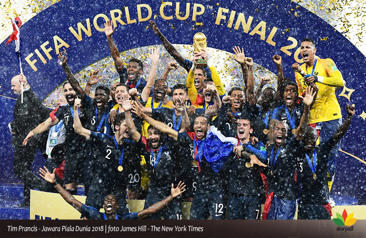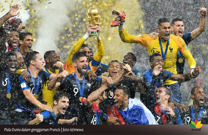HUJAN membasahi stadium Luzhniki – Moscow, Russia, Ahad (18/7/18). Benar prediksi Ivan Rikitic, tak mudah bagi Tim Kroasia menaklukkan Prancis, meski melalui perjuangan tak kenal lelah. Prancis memenangkan Piala Dunia FIFA 2018, dan memboyong piala kebanggaan sepakbola dunia itu ke Paris, dengan skor 4-2, di bawah kontrol wasit Nestor Pitana dari Argentina.