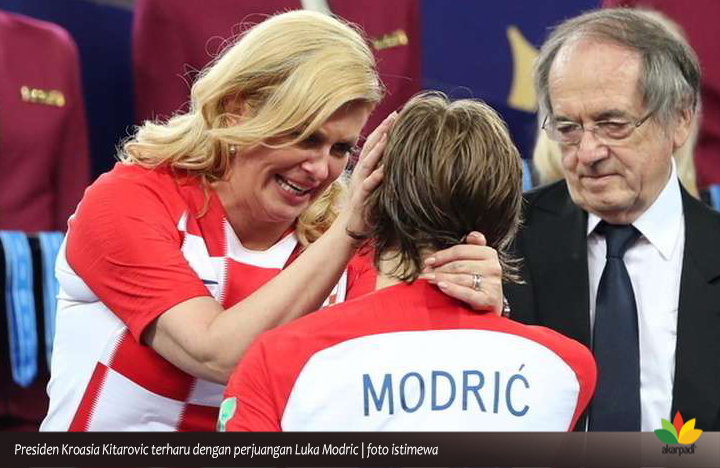 Presiden Kroasia yang memberi support penuh kepada timnya, itu memberikan pelukan hangat kepada seluruh tim dan pelatih Kroasia dan Prancis. Pun kepada wasit dan hakim garis. Nampak dia memberi semangat kepada seluruh pemain dan berbincang khas beberapa menit dengan pelatih Kroasia, Zlatko Dalic.