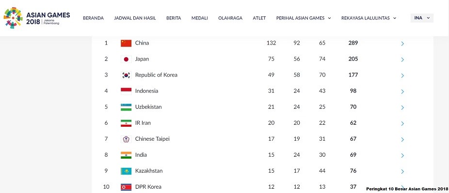 Duduk di posisi keempat kiranya tidaklah buruk bagi prestasi olahraga Indonesia pada ajang Asian Games kali ini. Sebab, bila dibandingkan dengan ajang Asian Games sebelumnya, yakni pada tahun 2014, Indonesia hanya meraih 4 medali emas, 5 medali perak, dan 11 medali perunggu.