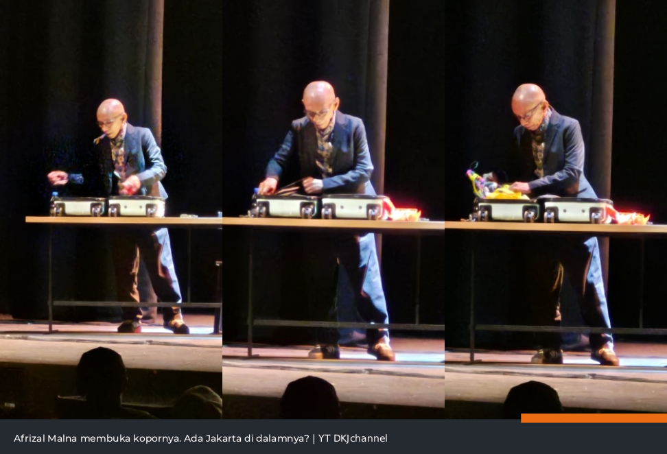 Zal membuka performanya dengan kalem. Melangkah tenang melintasi panggung sambil 'menyeret' kopor kecil. Meletakkannya di atas meja, membuka dan mengeluarkan barang-barang yang terdapat di dalamnya, termasuk bando anak-anak. Penampakan laku Zal dalam realitas pertama kehidupan. Zal menyimpan Jakarta dalam kopor.