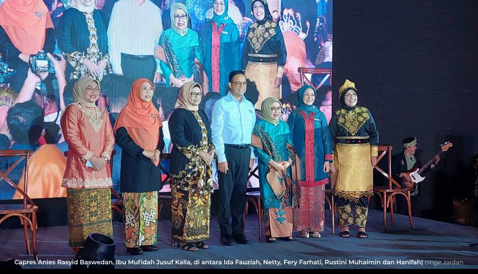 Prof. Aliyah Baswedan dan Fery Farhati Ganis (ibu dan istri Anies Baswedan - Calon Presiden pasangan AMIN No.1 Pilpres RI 2024), Ibu Mufidah Jusuf Kalla (istri Wakil Presiden 2004 - 2009 dan 2014-2019 M. Jusuf Kalla), Rustini Muhaimin (istri Cawapres Abdul Muhaimin Iskandar), Ida Fauziyah - Menteri Tenaga Kerja, Netty Prasetyani - Anggota DPR RI, beserta seluruh undangan yang hadir, larut dalam suasana melodius. Di giant wall, latar belakang panggung, tampak berbagai adegan situasi mutakhir di Gaza - Palestina yang digempur zionis Israel.