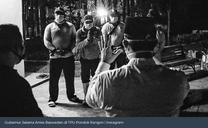 Anies berada di antara petugas pemakaman yang harus bergadang, karena kuatir bakal ada lagi jenazah yang dikirim rumah sakit untuk dimakamkan dengan prosedur Covid-19.