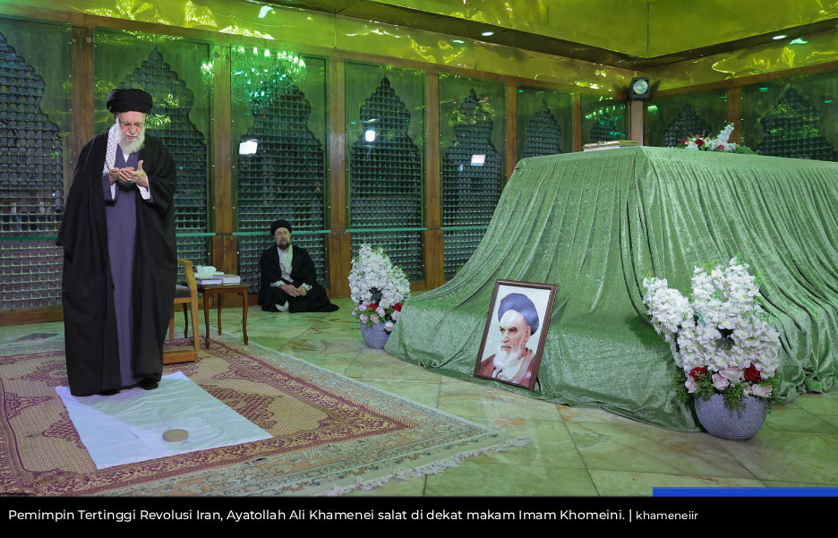 Nampak Khamenei menegakkan salat di makam Ayatullah Ruhullah Khomeini, sekaligus memberi penghormatan kepada para martir Revolusi.
