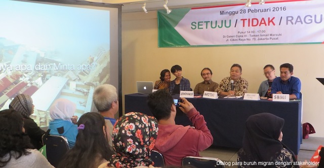 Suara-suara dan nasib buruh migran di negeri Formosa ini dihadirkan dalam ruang dialog yang merepresentasikan fenomena buruh migran di Taiwan. Dialog yang berjuluk, “Setuju/Tidak/Ragu” itu digagas oleh pasangan seniman, Irwan Ahmett dan Tita Salina, pada Minggu, 28 Februari 2016 di Galeri Cipta III, Taman Ismail Marzuki, Jakarta.