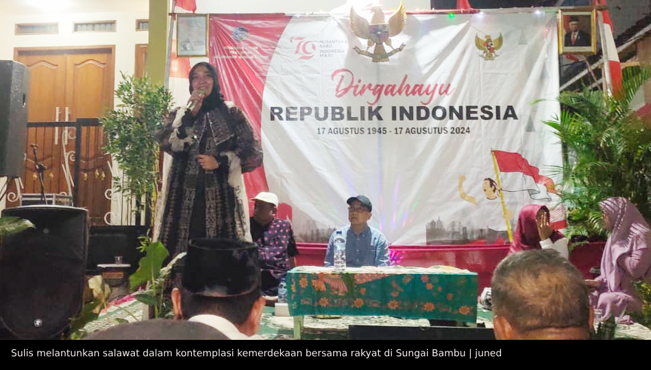 JAKARTA | Cucu pahlawan nasional Haji Agus Salim dan pelantun salawat sohor, Sulis memperingati 79 tahun kemerdekaan Republik Indonesia bersama warga RT 001 RW 008 Kelurahan Sungai Bambu, Tanjung Priok, Jakarta Utara (Jum'at - 16 Agustus 2024).