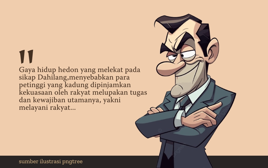 Gaya hidup hedon yang melekat pada sikap dahilang menyebabkan para petinggi yang kadung dipinjamkan kekuasaan oleh rakyat melupakan tugas dan kewajiban utamanya, yakni melayani rakyat. Dengan sendirinya pula menjadi a histortis.