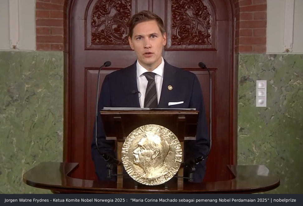 "Komite Nobel Norwegia telah memutuskan untuk menganugerahkan Hadiah Nobel Perdamaian tahun 2025 kepada Maria Kurina Machado," ujar Jørgen Watne Frydnes, Ketua Komite Nobel Norwegia, saat secara resmi mengumumkan kemenangan tersebut di Institut Nobel Norwegia di Oslo, Jum'at (10/10/25).