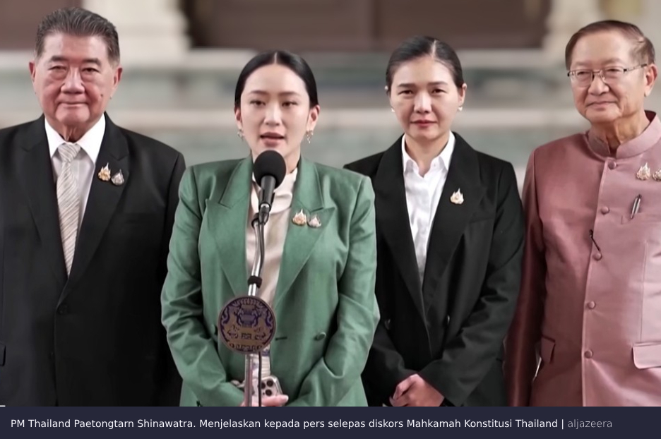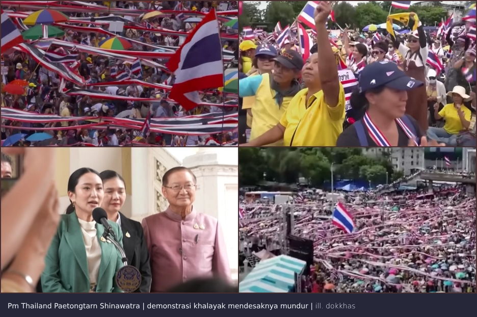 Perdana Menteri (PM) Thailand, Paetongtarn Shinawatra, 38, boleh jadi sudah mengira kalau dia bakal dikenakan sanksi oleh Mahkamah Konstitusi Thailand. Lantaran khalayak bergerak, melakukan aksi demo, meminta dirinya mundur dari jabatan puncak pemerintahan, menyusul petisi 36 senator yang diajukan kepada Mahkamah Konstitusi.